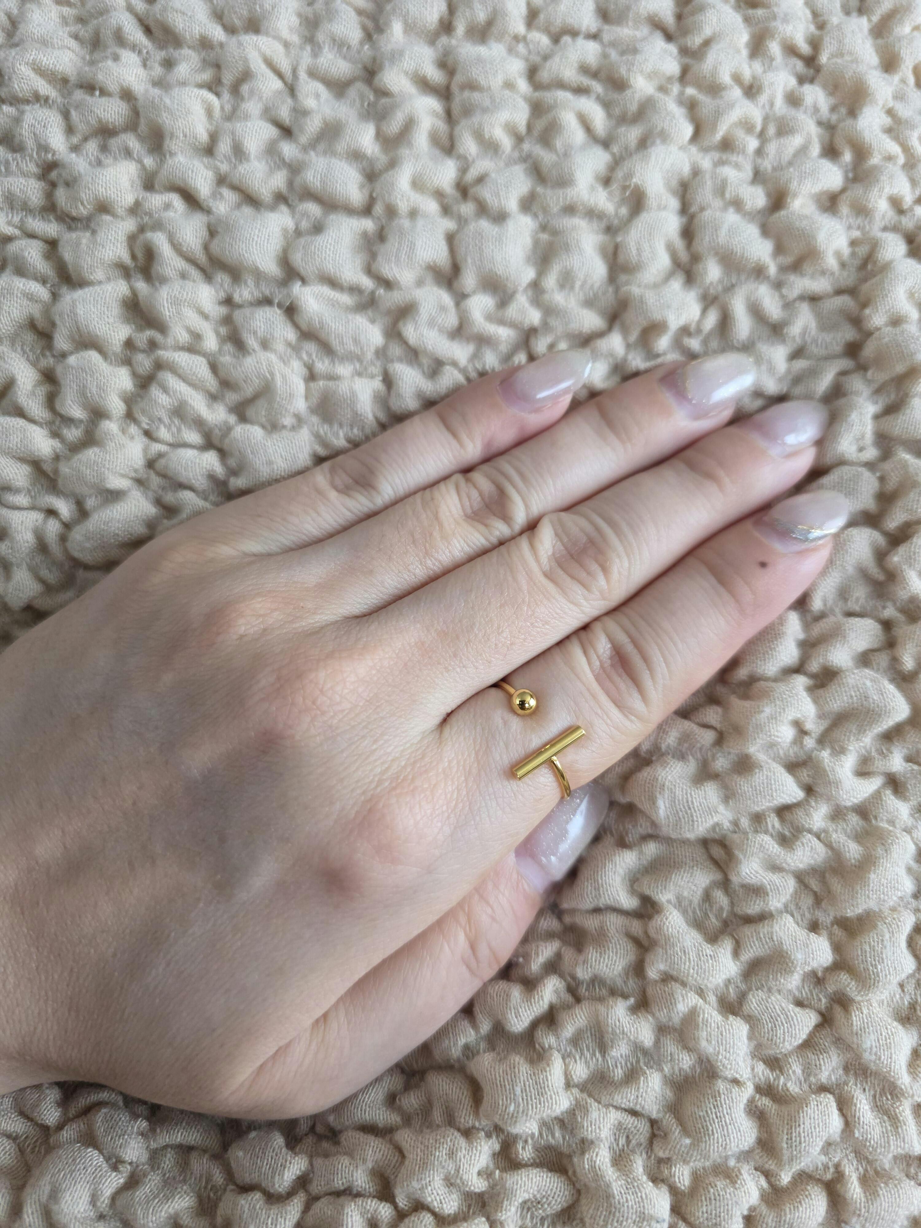先端に小さなボールとメタルバーを配した、ユニークなオープンデザインリング。指元に遊び心をプラスし、重ね付けにもおすすめです。