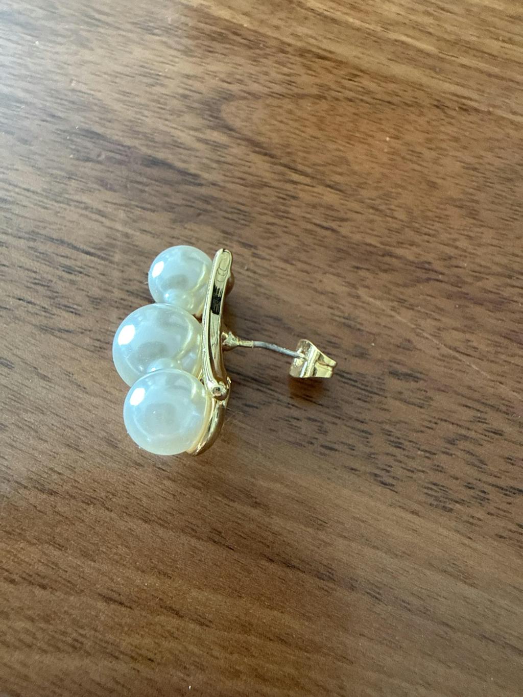 ゴールドのプレートに3連パールが並ぶピアス。耳に沿うように湾曲されたデザインがポイント。